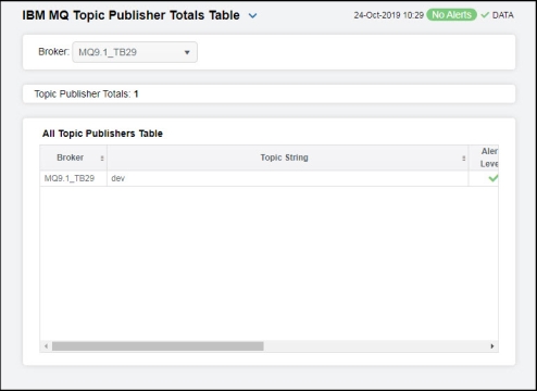 | • | IBM MQ Topic Publisher Totals Summary: Clicking MQ Topic Publisher Totals Summary in the left/navigation menu opens this display, which allows you to view current alert status and performance metrics based on the total messages sent by a specific publisher on a specific MQ broker. |