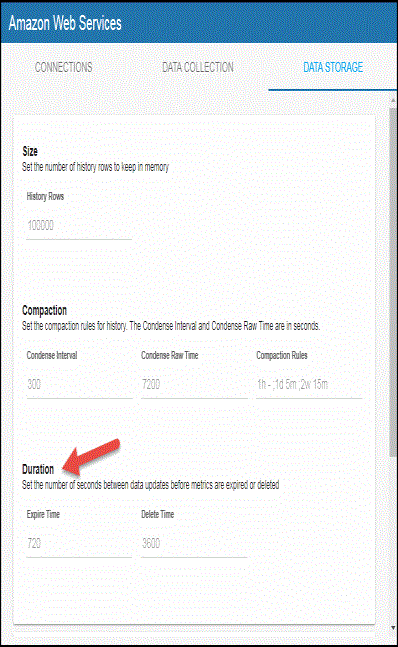 Condense Raw Time-- The time span of raw data kept in the cache history table. The default is 7200 seconds. The following cache is impacted by this setting: AwsEc2InstanceStats.