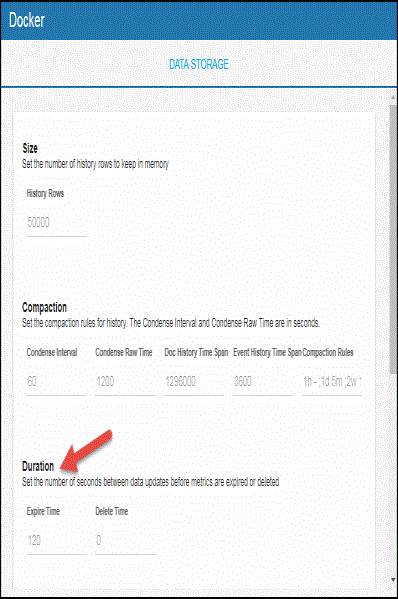 Condense Raw Time -- The time span of raw data kept in the cache history table for the following caches: DockerContainer and DockerEngine. The default is 1200 seconds.