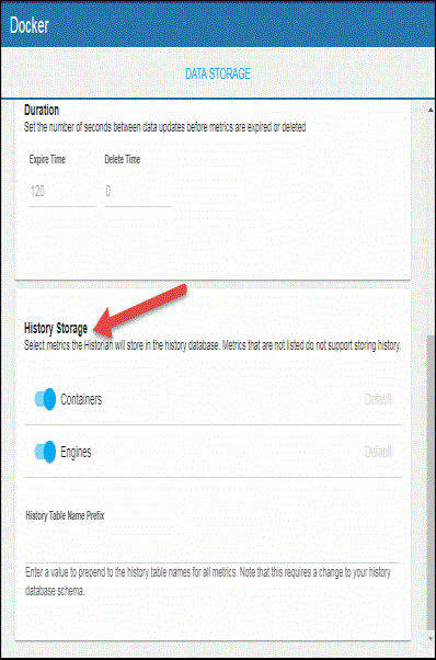 The History Storage region allows you to select which metrics you want the Historian to store in the history database. By default, historical Containers (DockerContainer cache) and Engines (DockerEngine cache) are saved to the database. To disable the collection of this historical data, perform the following steps: