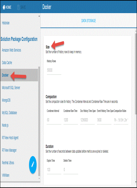 You can modify the maximum number of history rows to store in memory in the DATA STORAGE tab. The History Rows property defines the maximum number of rows to store for the DockerContainer, DockerEngine, and DockerContainerEvent caches. The default settings for History Rows is 50,000. To update the default setting: