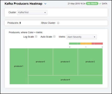 Select the metric driving the heatmap display. The default is Alert Severity. Each Metric has a color gradient bar that maps values to colors. Mouse-over any rectangle to display the current values of the metrics for the producer. Click on a rectangle to drill-down to the associated Kafka Single Producer Summary display for a detailed view of metrics for that particular producer. |