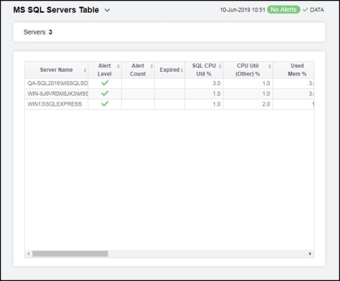 This table provides a view of all of your servers and their associated metric data including instance, alert severity, alert count, and the current value of each gathered metric. You can click a column header to sort column data in numerical or alphabetical order, and drill-down and investigate by double-clicking a row to view details for the selected server in the MS SQL Server Summary display.