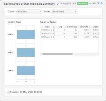 | • | Single Broker Topics Lag Summary: Opens the Kafka Single Broker Topic Lag Summary display, which displays the lag per topic in a bar graph format and lists the lag per topic for the broker. |