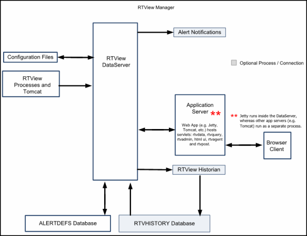 RTViewCentral includes the RTView Manager, which runs as a separate process to monitor the Central Server, all integrated RTViewDataServers, and Tomcat. The RTView Manager monitor is accessible in Tomcat at http://host:port/rtview-manager and also in Jetty that is running in the RTView Manager data server at http://localhost:3070/rtview-manager.