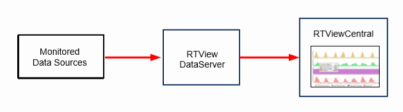 The following figure illustrates RTViewCentral, a single RTView DataServer and the basic data flow from the monitored data sources.