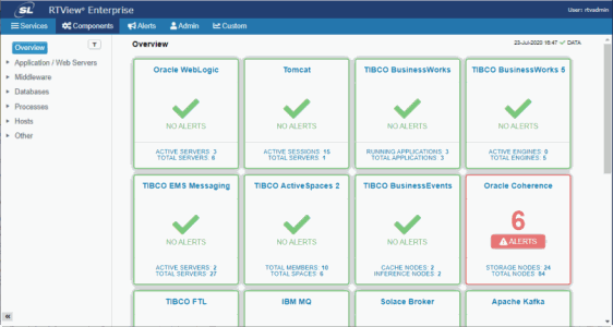 The Overview page (shown below), located in the Components tab, opens by default. Notice the navigation tabs in the title bar--the Services Tab, Components Tab, Alerts Tab, Admin Tab and the Custom Tab--this section describes each of them.