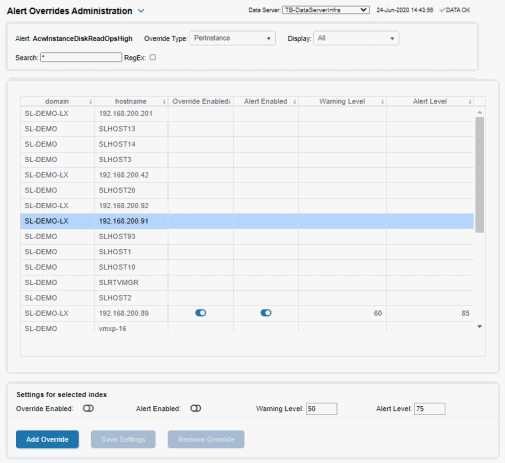 Select an Override Type from the drop-down menu (depending on the alert, there might be only one type) and then select one or more rows from the table. Under Settings for selected index (in the lower portion of the screen), modify settings for the Override Enabled, Alert Enabled, Alert Delay, Warning Level and/or Alarm Level, then click Add Override. The table updates with your new settings.
