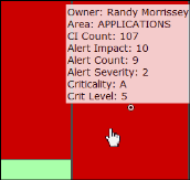 The mouse-over functionality provides additional detailed data in an over imposed pop-up window when you mouse-over a heatmap. The following figure illustrates mouse-over functionality in a heatmap object. In this example, when you mouse-over a host, details are shown such as CI Count, Alert Impact, Alert Severity, and Criticality.