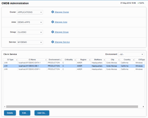 After you determine how to adapt your organization to the four levels of the CMDB, use the Administration -CMDB Admin display to map each CI to a Service, Group, Area and Owner. The name of the CI can indicate which Service you want to associate the CI with.
