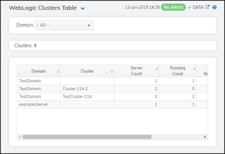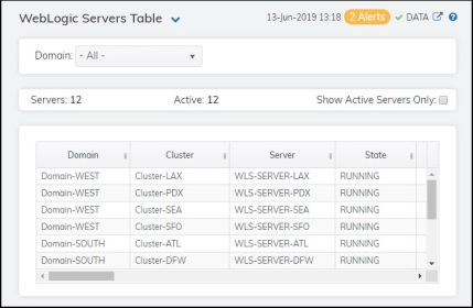 | • | Clusters Table: Opens the WebLogic Clusters Table display, which enables you to track utilization and performance metrics for all clusters on a particular domain, or on all domains. |