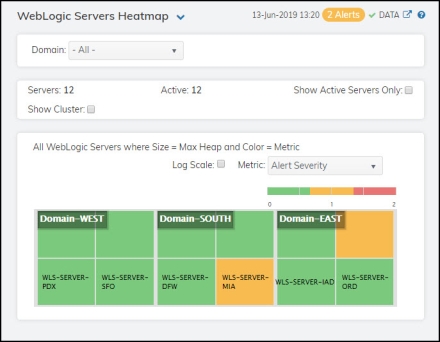 Clicking Servers Heatmap in the left/navigation menu opens the WebLogic Servers Heatmap display, which allows you to view the status and alerts of all Oracle® WebLogic servers. You can view the servers in the heatmap based on the following metrics: Alert Severity, Alert Count, Jvm CPU %, Host CPU %, Jvm Memory %, Open Sockets, Thread Total Count, and Hogging Threads.