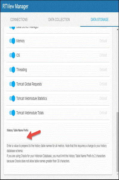 You can modify the maximum number of history rows to store in memory in the DATA STORAGE tab. The History Rows property defines the maximum number of rows to store for the JvmGcInfo, JvmMemoryPool, RtvDataServerManager, RtvDisplayServerManager and RtvDataServerClientTotals caches. The default setting forHistory Rows is 50,000. The History Rows Large property defines the maximum number of rows to store for the JvmOperatingSystem, JvmThreading, JvmMemory, RtvDataServerClientStats and TomcatWebModuleStats caches. The default setting for History Rows Large is 200,000. To update the default settings: