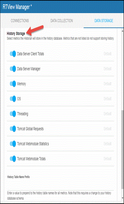 - In the History Storage region, select the toggles for the various metrics that you want to collect. Blue is enabled, gray is disabled.