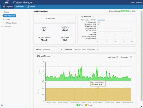 Use the RTView Manager application to track the health of your RTView Enterprise system: RTView and Tomcat processes, the historian and RTView data servers. RTView Manager runs as a process, separately from your RTView Enterprisemonitoring system, has its own URL / console, as well as its own data server, database, alert notification system and historian.