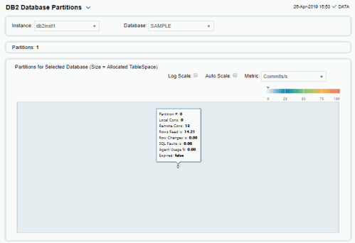 to apply log scale and mouse over a rectangle to see additional metrics. Click a rectangle to see performance metrics for the database in which the partition resides in the Single DB2 Database Summary display.