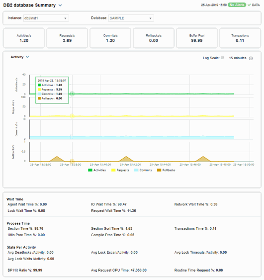 View trend graphs tracing Commits and Rollbacks per second, Wait and Response times, among others.