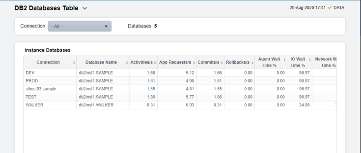 Use this display to investigate partitioning issues on a database. Select an Instance and a Database. Sort the list by column values such as DB2 Status, Rollbacks per second and many others.
