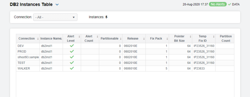 Investigate detailed configuration information for all DB2 instances. This display provides a list of all DB2 instances with details about Partition Counts and Pointer Bit Sizes, as well as Fix Packs, Service Levels, number of MonitoredDBs and the most critical Alert Levels.
