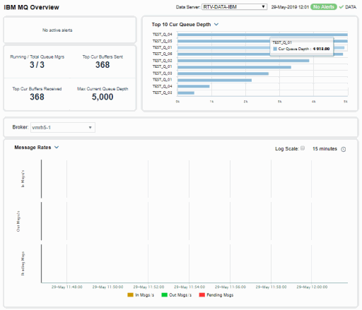 IBM MQ Queues View: The displays in this View present performance and utilization metrics for your IBM MQ Queue Managers. |