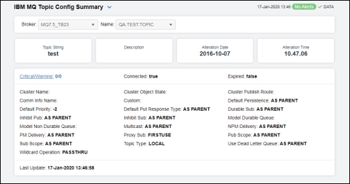 | • | IBM MQ Topic Config Summary: Clicking MQ Topic Config Summary from the left/navigation menu opens this display, which allows you to view current alert status and performance metrics for a specific topic configuration on a specific MQ broker. |
