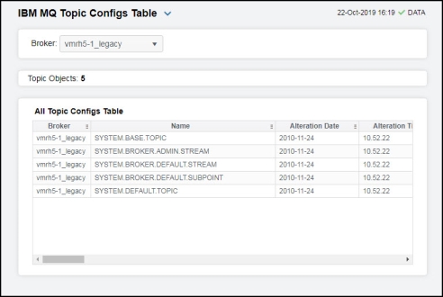 This View allows you to view performance and utilization metrics for all of your IBM MQ topic configs. Clicking IBM MQ Topic Configs in the left/navigation menu opens the IBM MQ Topic Configs Table display, which allows you to view current alert status and performance metrics of all topic configurations on a specific MQ broker in a table format.
