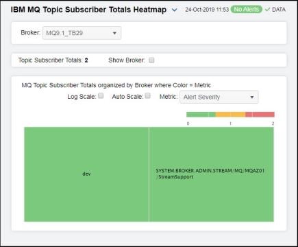 | • | IBM MQ Topic Subscriber Totals Heatmap: Clicking IBM MQ Topic Subscribers Totals Heatmap in the left/navigation menu opens this display, which allows you to view current alert status and performance metrics based on the total messages received by all subscribers for each topic on a specific MQ broker in a heatmap format. |