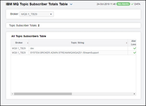 | • | IBM Topic Subscriber Totals Summary: Clicking IBM MQ Topic Subscribers Totals Summary in the left/navigation menu opens this display, which allows you to view current alert status and performance metrics based on the total messages received by all subscribers for a particular topic on a specific MQ broker. |