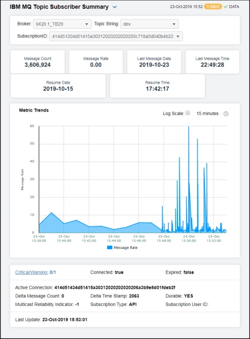 | • | IBM MQ Topic Subscriber Summary: Clicking IBM MQ Topic Subscriber Summmary in the left/navigation menu opens this display, which allows you to view current alert status and performance metrics for a specifig topic subscriber on a specific MQ broker. |