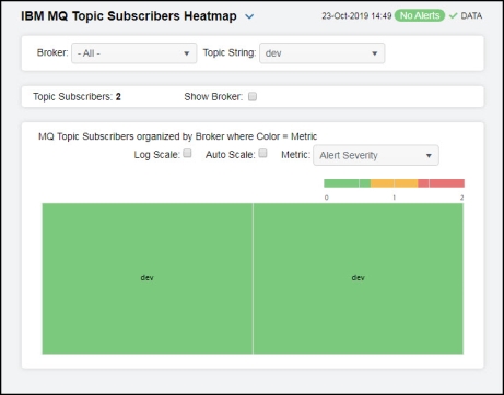 | • | IBM MQ Topic Subscribers Heatmap: Clicking MQ Topic Subscribers Heatmap in the left/navigation menu opens this display, which allows you to view current alert status and performance metrics of all topic subscribers on a specific MQ broker in a heatmap format. |
