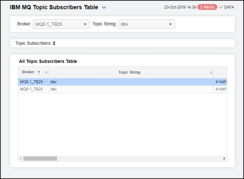 This display allows you to view current alert status and performance metrics of all topic subscribers on a specific MQ broker in a table format.
