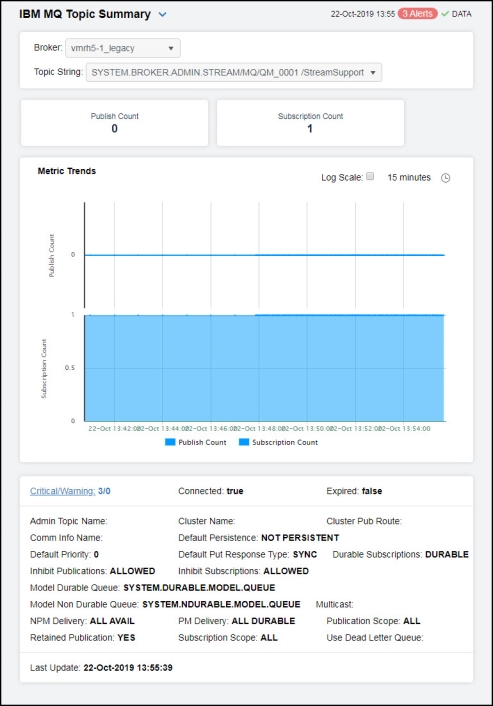 | • | IBM Topic Summary: Clicking MQ Topic Summary in the left/navigation menu opens this display, which allows you to view current alert status and performance metrics for a specific topic on a specific MQ broker. |