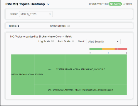| • | IBM MQ Topics Heatmap: Clicking MQ Topics Heatmap in the left/navigation menu opens this display, which allows you to view current alert status and performance metrics of all topics on a specific MQ broker in a heatmap format. |