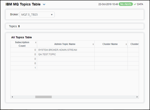 This display allows you to view current alert status and performance metrics of all topics on a specific MQ broker in a table format.