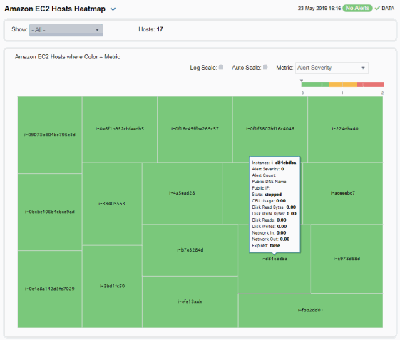 Choose All, Stopped or Running hosts from the Show drop-down menu. Each rectangle in the heatmap represents an Amazon EC2 instance. The rectangle color indicates the most critical alert state associated with the instance for the selected Metric.