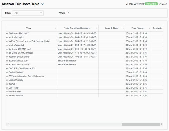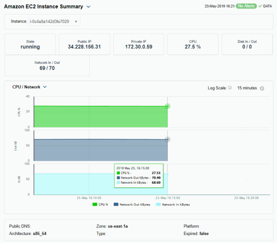 Investigate detailed configuration and utilization metrics for all Amazon EC2 instances. This display contains all metrics available for Amazon EC2 instances, including the Public DNS Name, CPU% utilization and Alert Level, where:
