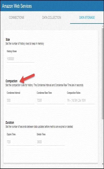 Compaction Rules-- This field defines the rules used to condense your historical data in the database. By default, the columns kept in history will be aggregated by averaging rows with the following rule 1h -;1d 5m;2w 15m, which means the data from 1 hour will not be aggregated (1h - rule), the data over a period of 1 day will be aggregated every 5 minutes (1d 5m rule), and the data over a period of 2 weeks old will be aggregated every 15 minutes (2w 15m rule). The following cache is impacted by this setting: AwsEc2InstanceStats.