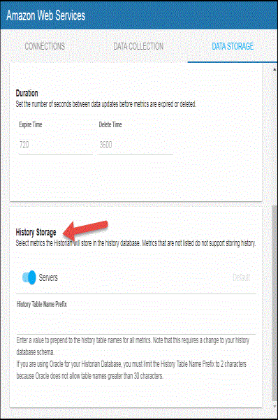 - In the History Storage region, select the toggle for the Servers metric to enable/disable collection of the metric. Blue is enabled, gray is disabled.