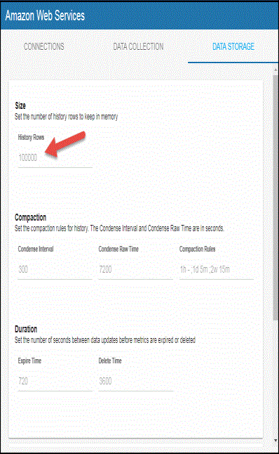 You can modify the maximum number of history rows to store in memory in the DATA STORAGE tab. The History Rows property defines the maximum number of rows to store for the AwsEc2InstanceStats cache. To update the default settings: