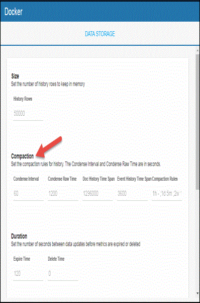 Compaction Rules -- This field defines the rules used to condense your historical data in the database for the following caches: DockerContainer and DockerEngine. By default, the columns kept in history will be aggregated by averaging rows with the following rule 1h -;1d 5m;2w 15m, which means the data from 1 hour will not be aggregated (1h - rule), the data over a period of 1 day will be aggregated every 5 minutes (1d 5m rule), and the data over a period of 2 weeks old will be aggregated every 15 minutes (2w 15m rule).