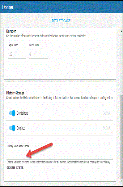 The History Storage region allows you to select which metrics you want the Historian to store in the history database. By default, historical Containers (DockerContainer cache) and Engines (DockerEngine cache) are saved to the database. To disable the collection of this historical data, perform the following steps: