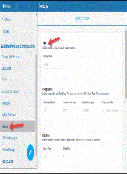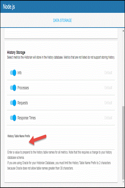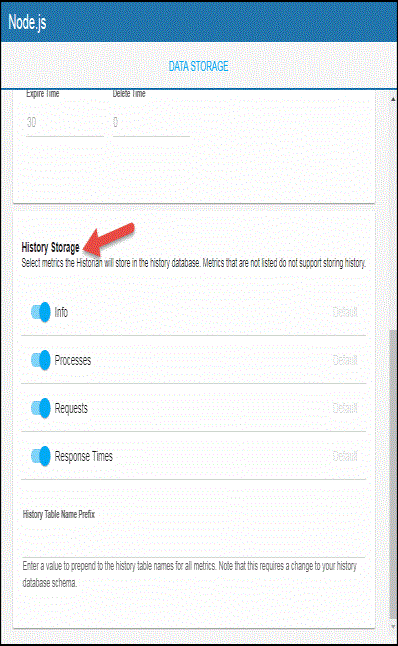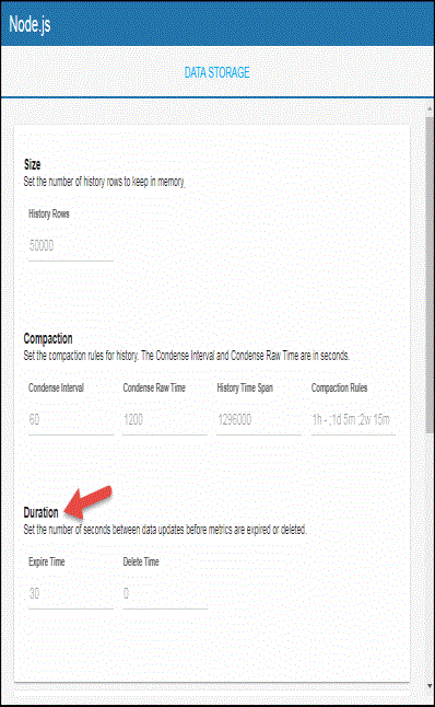 You can modify the maximum number of history rows to store in memory in the DATA STORAGE tab. The History Rows property defines the maximum number of rows to store for the NodeProcess, NodeResponseTime, NodeInfo, and NodeRequests caches. The default settings for History Rows is 50,000. To update the default setting: