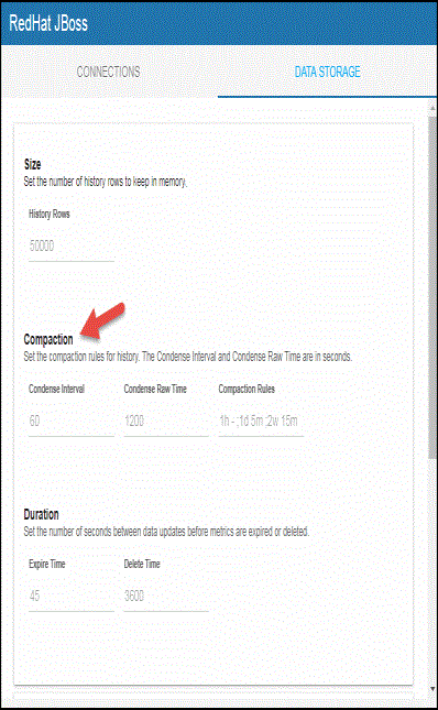 Compaction Rules -- This field defines the rules used to condense your historical data in the database for the following caches: JbossDeployments and JbossDeploymentTotals. By default, the columns kept in history will be aggregated by averaging rows with the following rule 1h -;1d 5m;2w 15m, which means the data from 1 hour will not be aggregated (1h - rule), the data over a period of 1 day will be aggregated every 5 minutes (1d 5m rule), and the data over a period of 2 weeks old will be aggregated every 15 minutes (2w 15m rule).