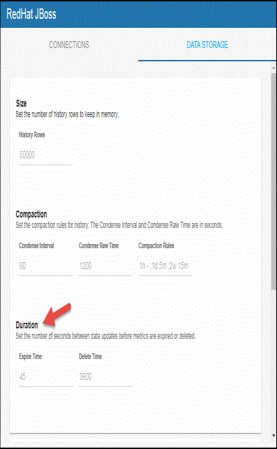 This section describes the additional optional RedHat JBoss Monitor configurations. You can specify the number of history rows to store in memory, the compaction rules, the duration before metrics are expired and deleted, and the different types of metrics that you want the Historian to store in the DATA STORAGE tab in the RTView Configuration Application.