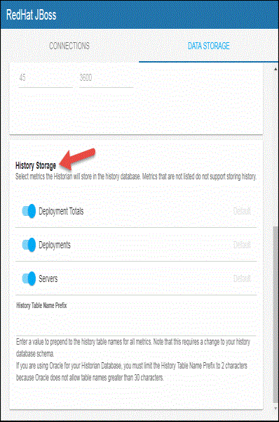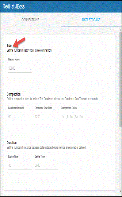 You can modify the maximum number of history rows to store in memory in the DATA STORAGE tab. The History Rows property defines the maximum number of rows to store for the JbossDeployments, JbossDeploymentTotals, and JbossServerStats caches. The default settings for History Rows is 50,000. To update the default setting: