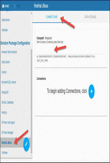 - On the CONNECTIONS tab, provide the correct full path to the directory containing the RedJat JBoss client jar files in the Classpath field.