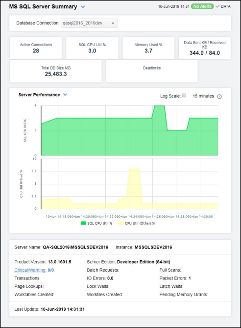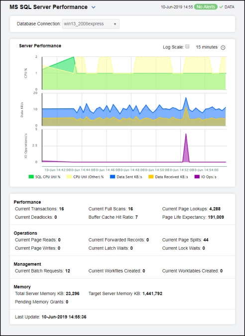 Server Performance SQL CPU Util % -- Traces the percentage of CPU used on SQL processing of the instance. CPU Util (Other) % -- Traces the percentage of CPU used by other processes on the instance. Server Throughput Current Data Sent KB -- Traces the amount of kilobytes being sent. Current Data Received KB -- Traces the amount of kilobytes being received. Current IO Reads -- Traces the number of input/output reads. Current IO Writes -- Traces the number of input/output writes. Server Operations Active Connections -- Traces the number of active connections. Current Batch Requests -- Traces the number of batch requests since the last data update. Current Latch Waits -- Traces the number of latch waits since the last data update. Current Lock Waits -- Traces the number of lock waits since the last data update. |