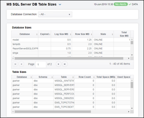 | • | Table Sizes: Opens the MS SQL Server DB Table Sizes display, which displays database and table sizes for a particular database server. |
