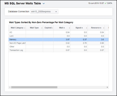 | • | Wait Stats: Opens the MS SQL Server Waits Table display, which displays server wait time details in a table format for a particular database server. |