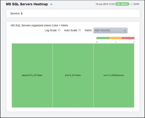 | • | MS SQL Servers Heatmap: Opens the MS SQL Servers Heatmap display, which provides a heatmap view of all MS SQL servers and their associated metrics. |